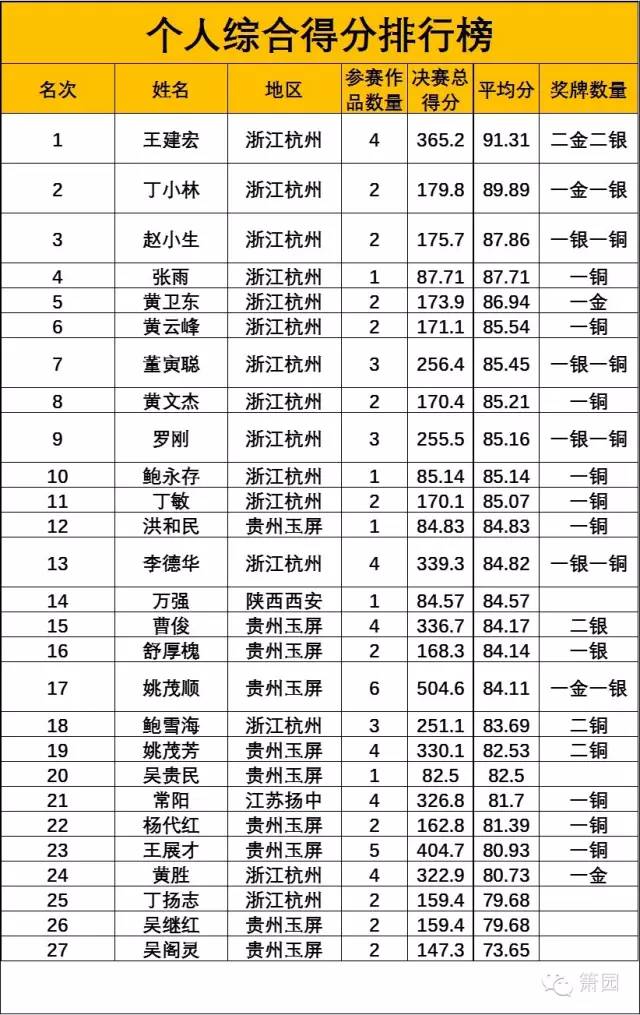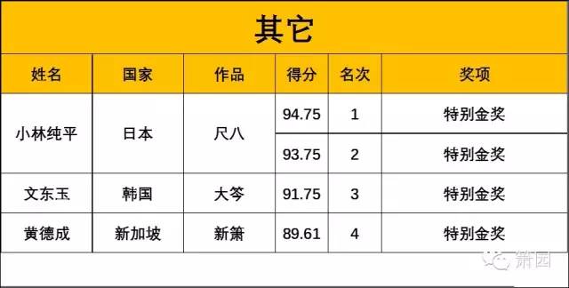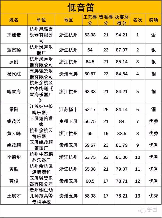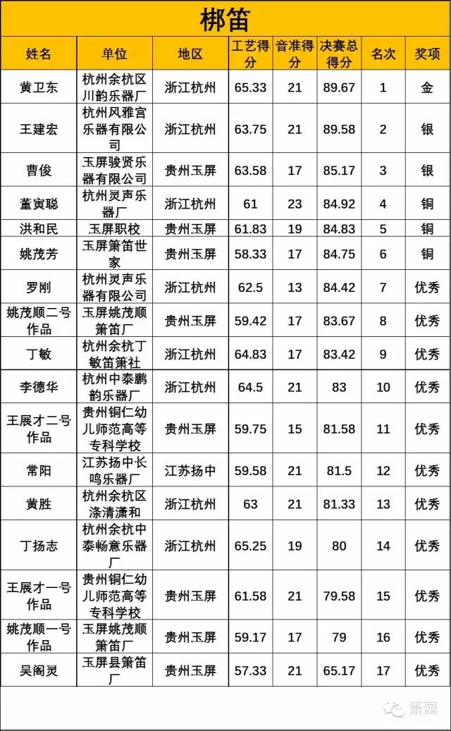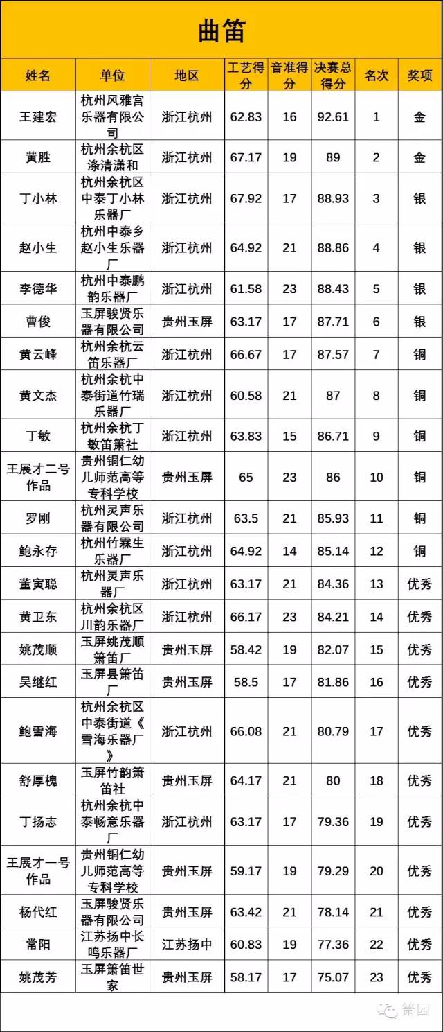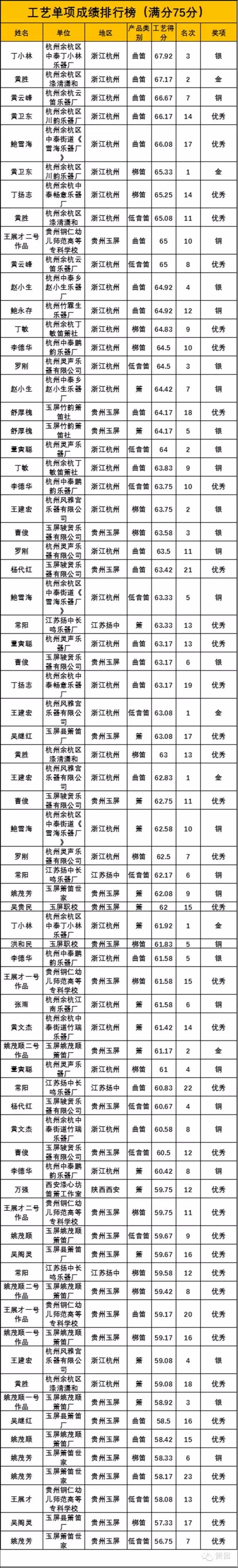 按工艺单项计算,丁小林的曲笛、黄胜的曲笛、黄云峰的曲笛获得了前三名,得分分别为67.92分、67.17分、66.17分(满分为75分),来自贵州玉屏的王展才的曲笛进入了前十名,得分为65分。