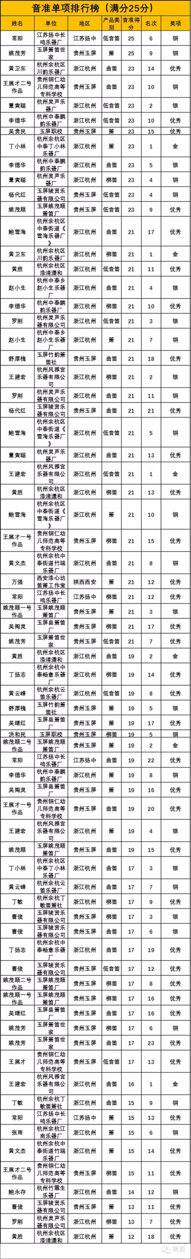 音准检测单项,江苏扬中常阳的低音笛和贵州玉屏姚茂芳的箫获得了25分满分的好成绩。获得23分的有黄卫东曲笛、王展才曲笛二号作品、董寅聪低音笛、李德华低音笛、吴贵民箫、丁小林箫、李德华曲笛、董寅聪梆笛、杨代红低音笛、姚茂顺低音笛。